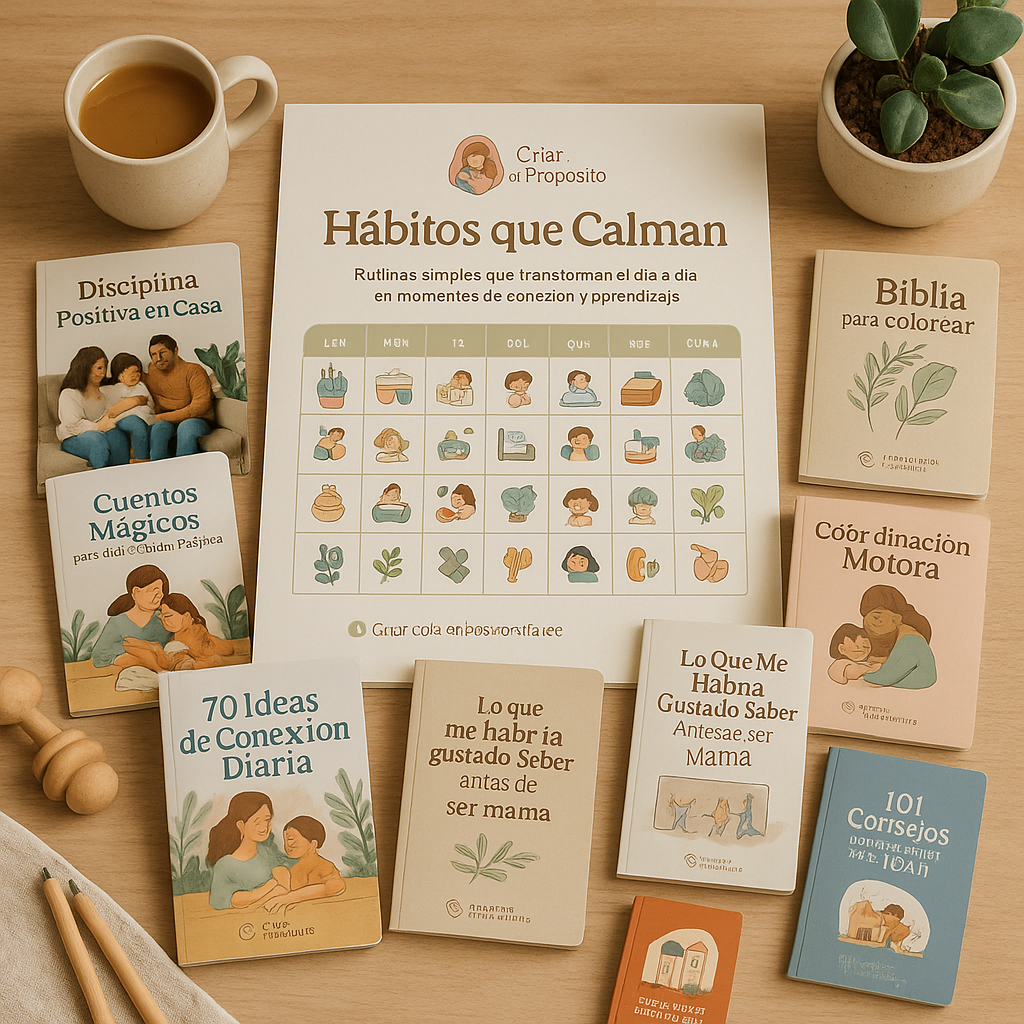 El kit Hábitos que calman incluye el calendario de rutinas diarias completo, ilustraciones y actividades para distintos momentos del día (mañana, tarde y noche), más una guía práctica para padres con sugerencias de uso y acompañamiento emocional.